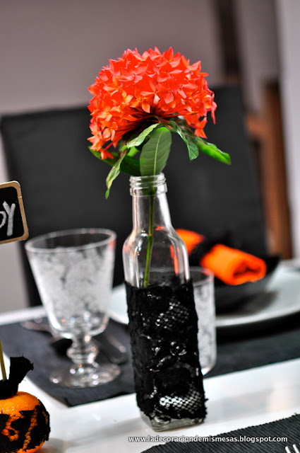 Ya sabéis, por ocasiones anteriores, que siempre intento utilizar, para estas decoraciones, cosas que tengo en casa, bien reciclándolas o bien tuneándolas. Esta vez, para el motivo principal de la mesa, he usado mandarinas y unas botellas de vinagre que he cubierto con encaje negro y que han servido como floreros.